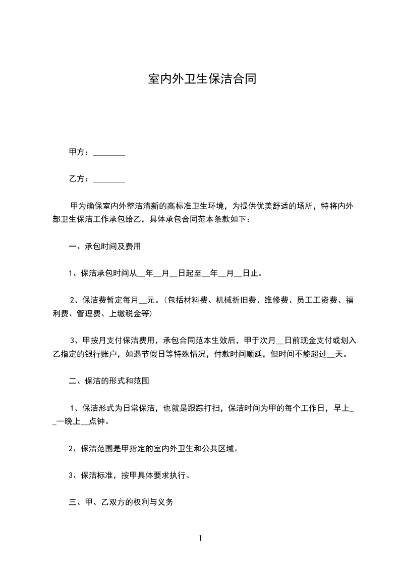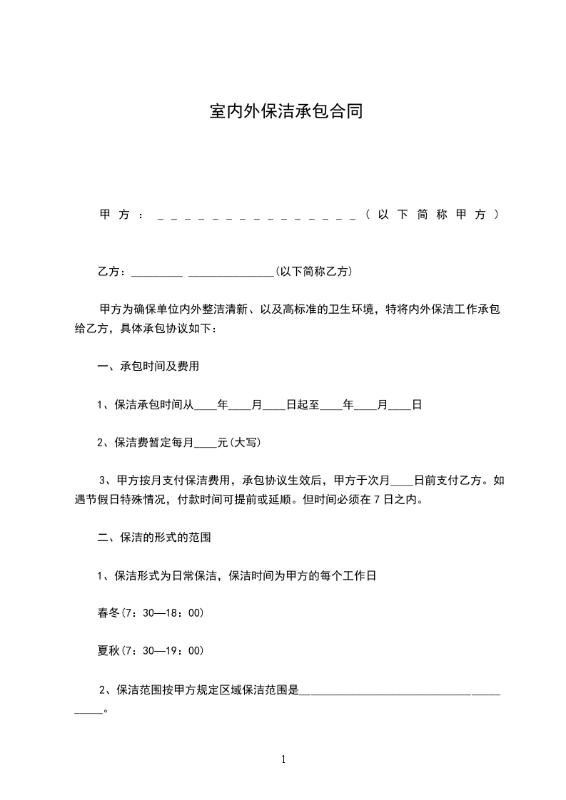 甲方为确保单位内外整洁清新、以及高标准的卫生环境,特将内外保洁工作承包给乙方,具体承包协议如下: