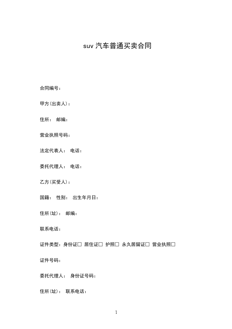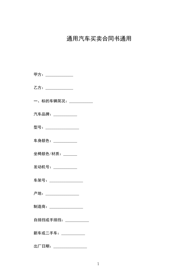 第一条 汽车品牌、型号、颜色、数量 乙方按自己的意愿选购 ____产 __________牌, 车型_____,发动机号为 _______,底盘号 __________,功率 _____,车架号 _____,外观为____ 颜色的汽车壹辆。