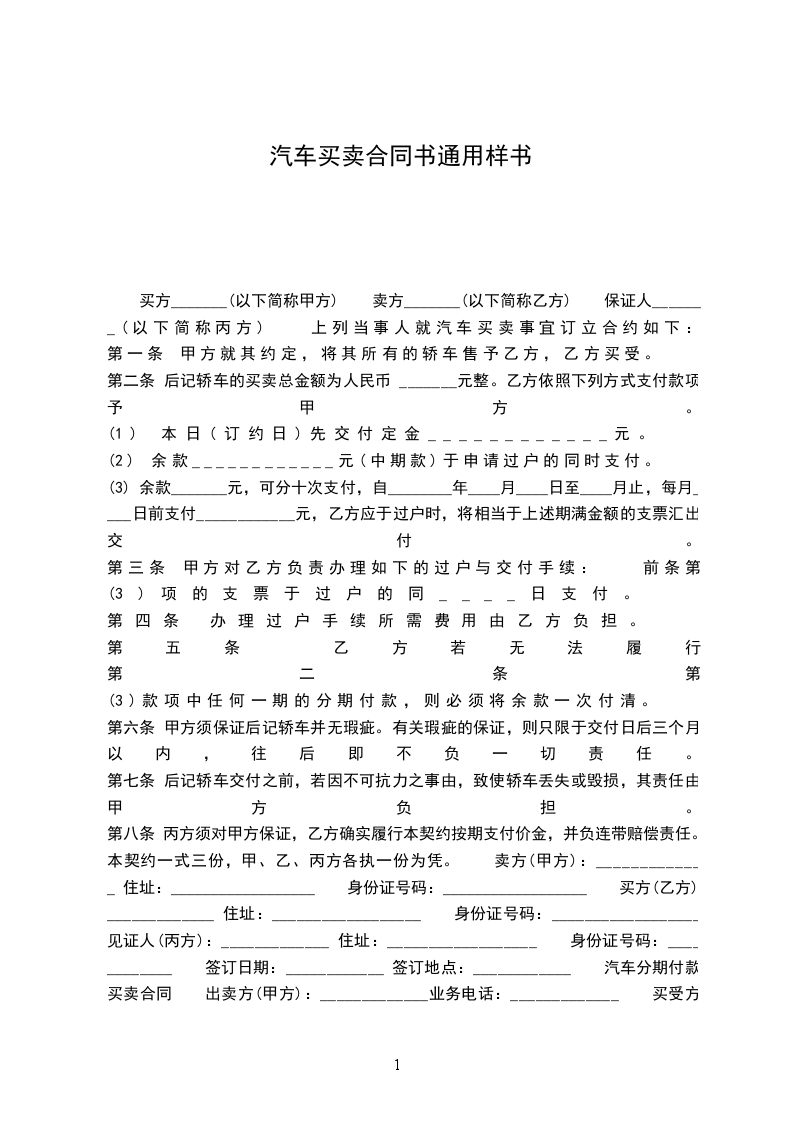 第八条 丙方须对甲方保证,乙方确实履行本契约按期支付价金,并负连带赔偿责任。 本契约一式三份,甲、乙、丙方各执一份为凭。 卖方(甲方):_____________ 住址:__________________ 身份证号码:__________________ 买方(乙方):_____________ 住址:__________________ 身份证号码:__________________ 见证人(丙方):_____________ 住址:__________________ 身份证号码:____________ 签订日期:____________ 签订地点:____________ 汽车分期付款买卖合同 出卖方(甲方):_____________业务电话:_____________ 买受方(乙方):_____________