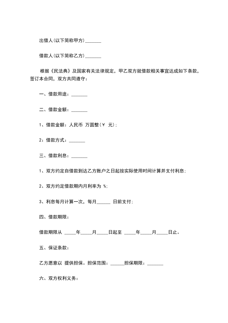 根据《民法典》及国家有关法律规定,甲乙双方就借款相关事宜达成如下条款,签订本合同,双方共同遵守: