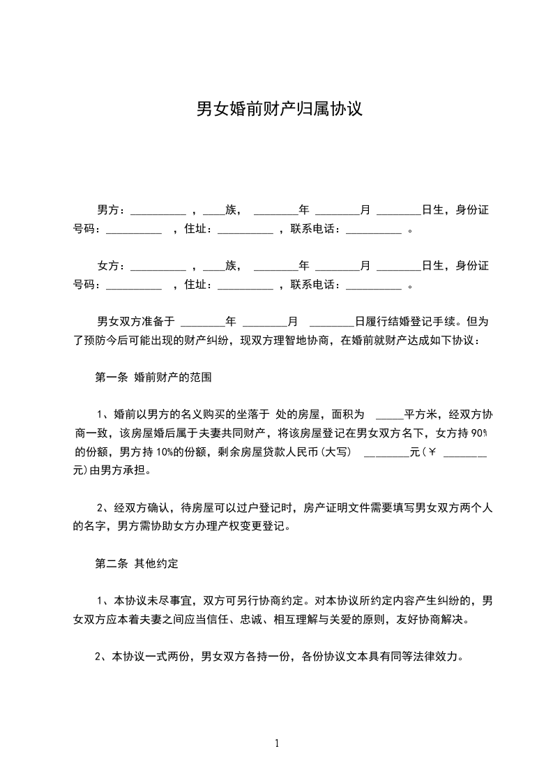 1、婚前以男方的名义购买的坐落于 处的房屋,面积为 _____平方米,经双方协商一致,该房屋婚后属于夫妻共同财产,将该房屋登记在男女双方名下,女方持90%的份额,男方持10%的份额,剩余房屋贷款人民币(大写) ________元(¥ ________元)由男方承担。