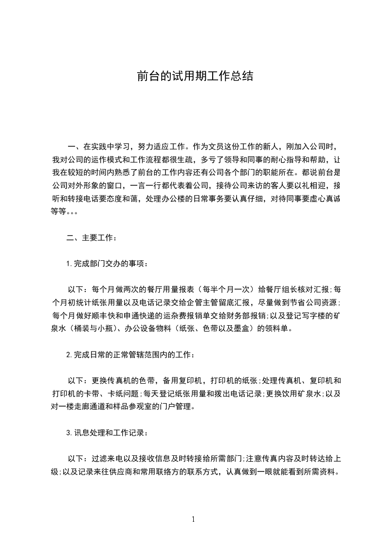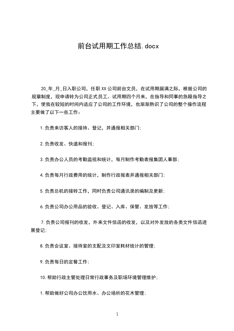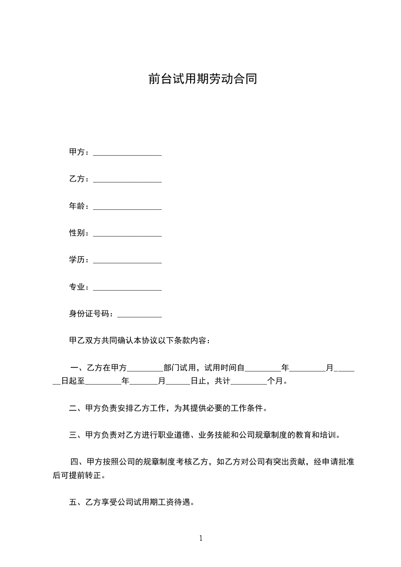 一、乙方在甲方_________部门试用,试用时间自_________年_________月_______日起至_________年_______月______日止,共计_________个月。