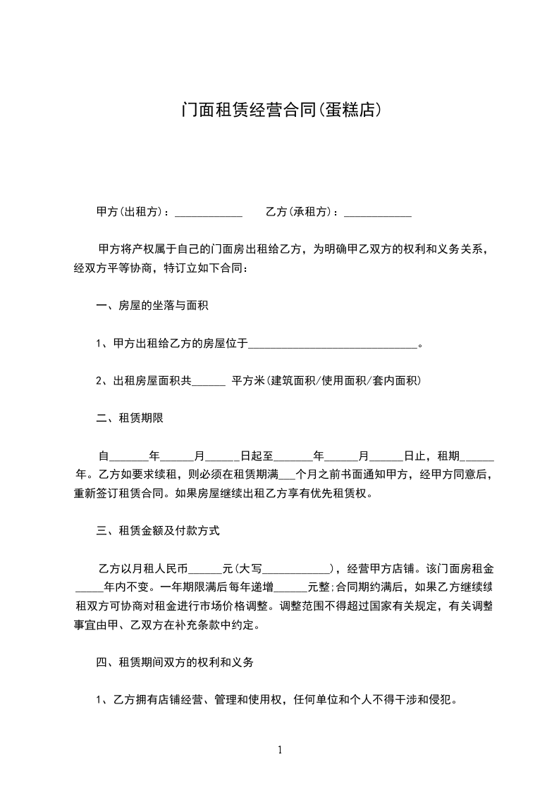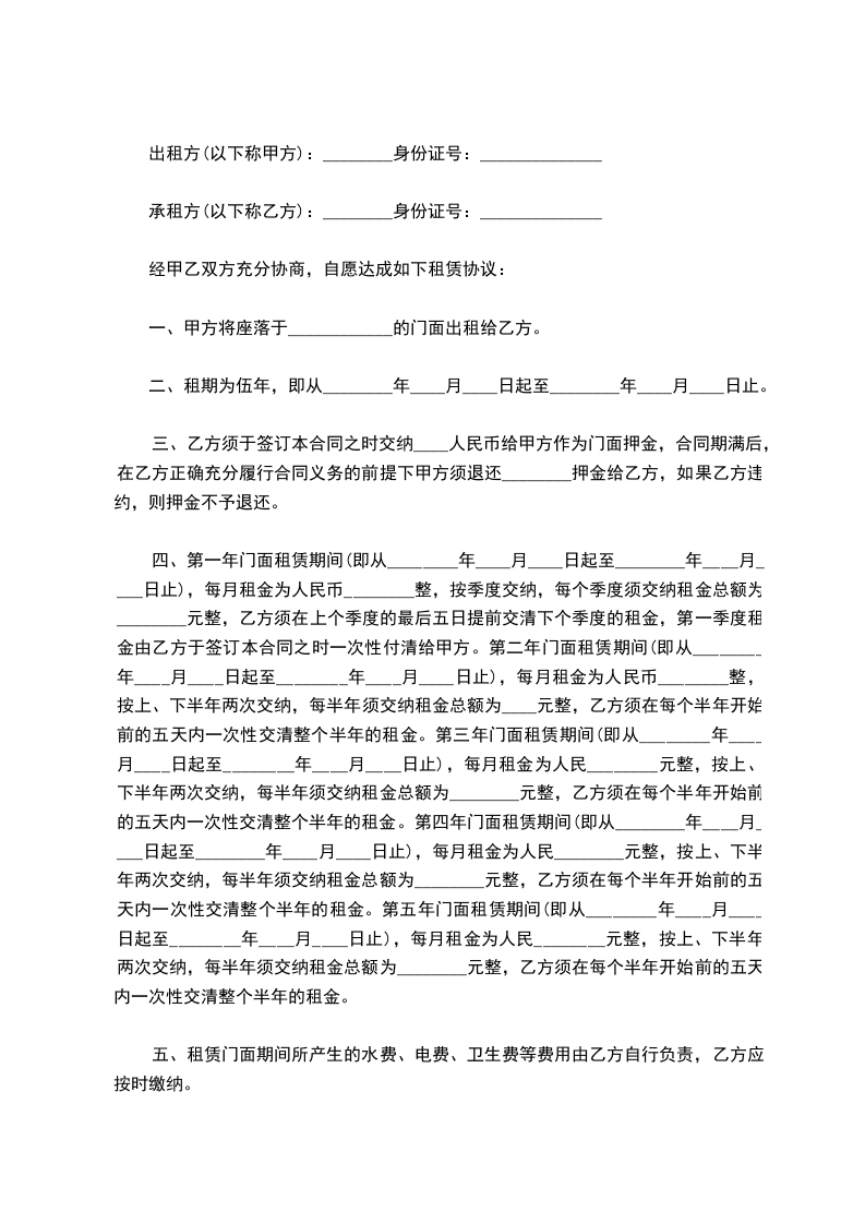 乙方以月租人民币______元(大写____________),经营甲方店铺。该门面房租金_____年内不变。一年期限满后每年递增______元整;合同期约满后,如果乙方继续续租双方可协商对租金进行市场价格调整。调整范围不得超过国家有关规定,有关调整事宜由甲、乙双方在补充条款中约定。