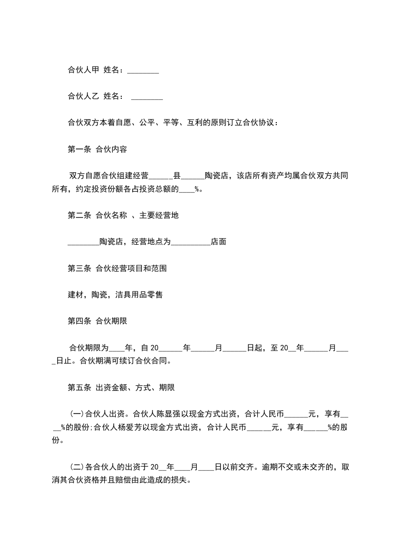 双方自愿合伙组建经营___________陶瓷店,该店所有资产均属合伙双方共同所有,约定投资份额各占投资总额的___________%。