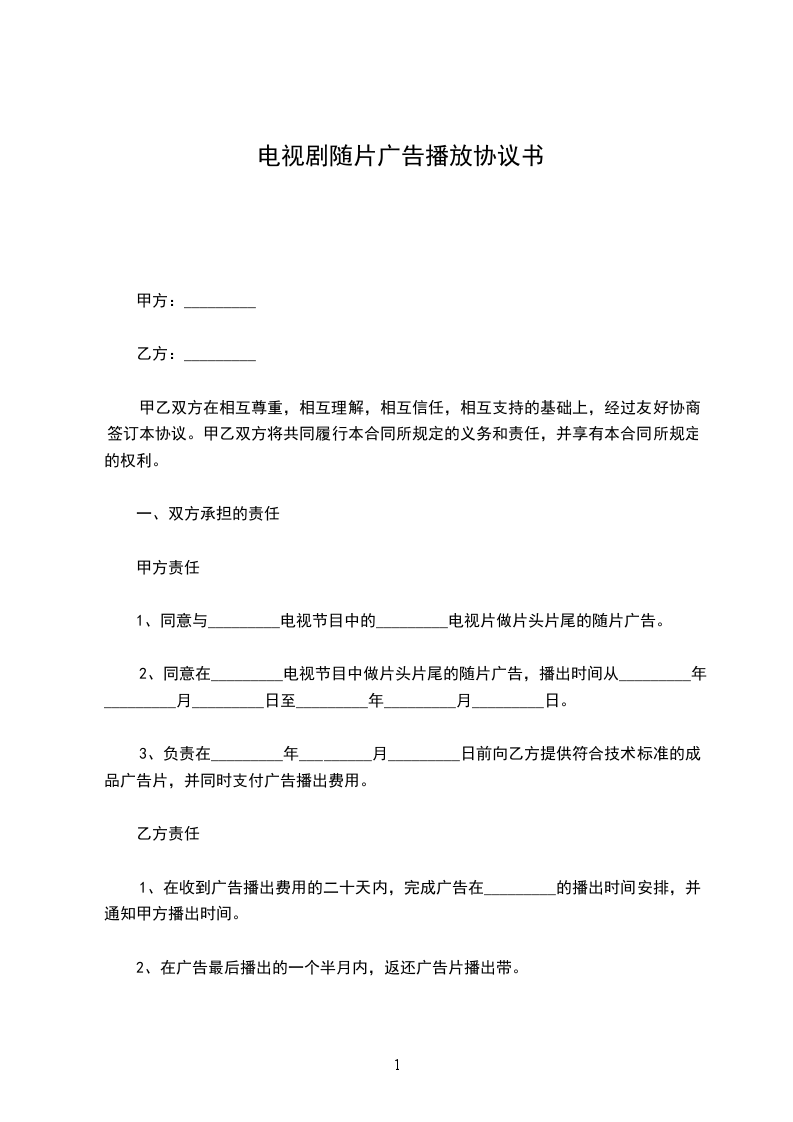 2.同意在_____电视节目中做片头/片尾的随片广告,播出时间从___年___月___日至___年___月___日。