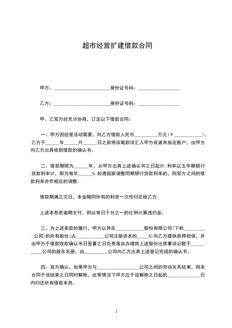 四、双方确认,如果甲方与__________________公司之间的劳动关系结束,则本合同于该结束之日同时解除,此等情况下甲方应于该解除之日起的______________日内归还所有借款本息。