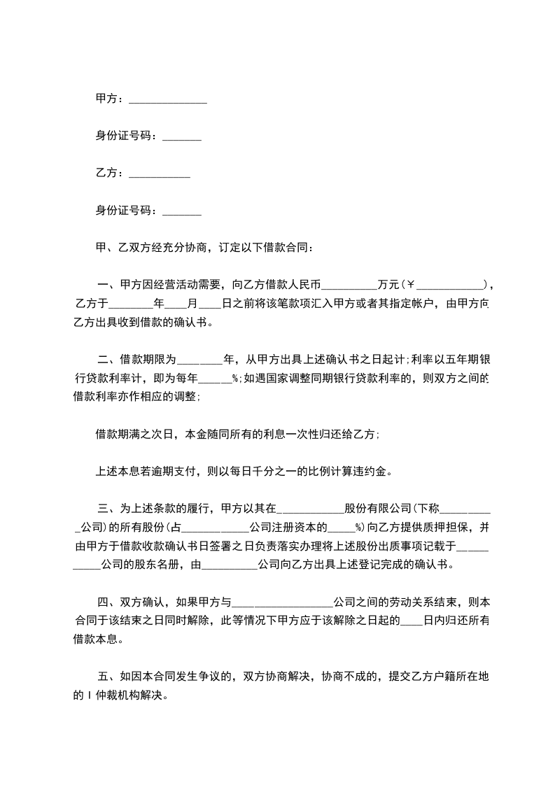 四、双方确认,如果甲方与__________________公司之间的劳动关系结束,则本合同于该结束之日同时解除,此等情况下甲方应于该解除之日起的____日内归还所有借款本息。