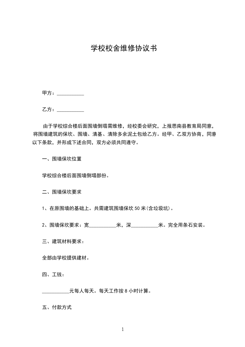 根据《 民法典》、《建筑法》的有关规定,结合本工程具体情况,为了确保用材及施工质量,经双方协商同意签订本校园房屋维修合同:_______
