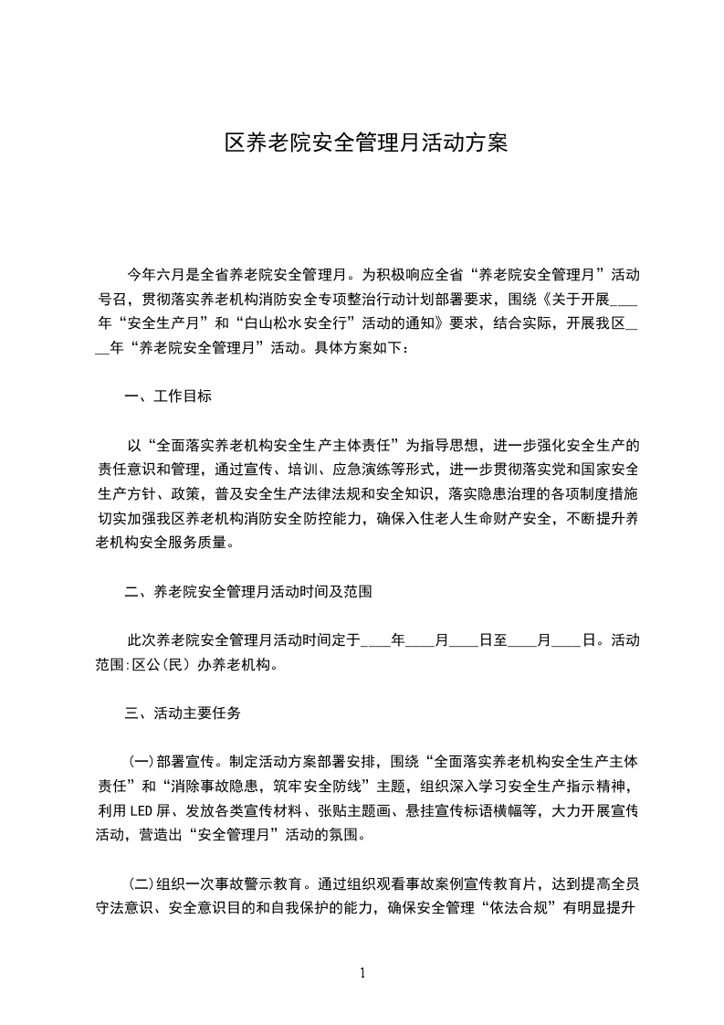 此次养老院安全管理月活动时间定于____年____月____日至____月____日。活动范围:区公(民)办养老机构。