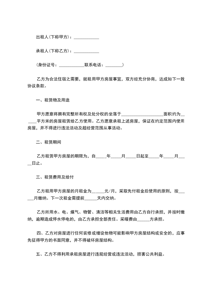 乙方为合法住宿之需要,就租用甲方房屋事宜,双方经充分协商,达成如下一致协议条款。