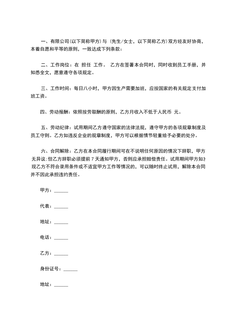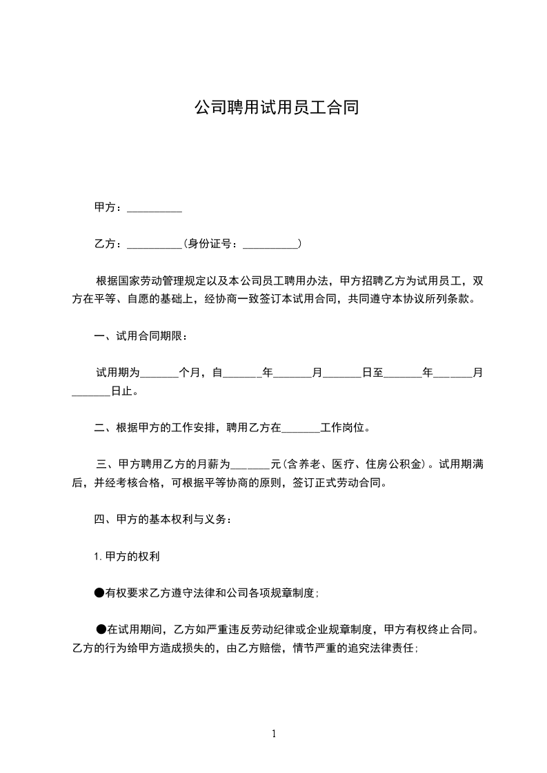 根据国家劳动管理规定以及本公司员工聘用办法,甲方招聘乙方为试用员工,双方在平等、自愿的基础上,经协商一致签订本试用合同,共同遵守本协议所列条款。