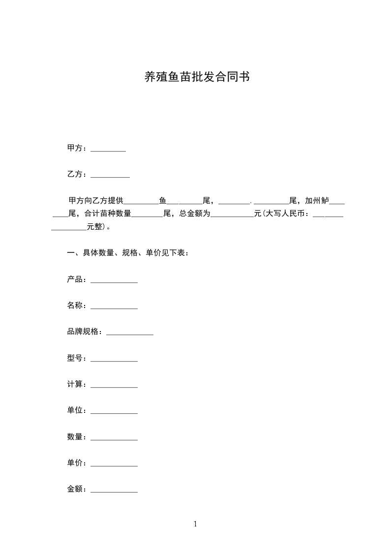 甲方向乙方提供_________鱼_________尾,________._________尾,加州鲈________尾,合计苗种数量________尾,总金额为___________元(大写人民币:_________________元整)。