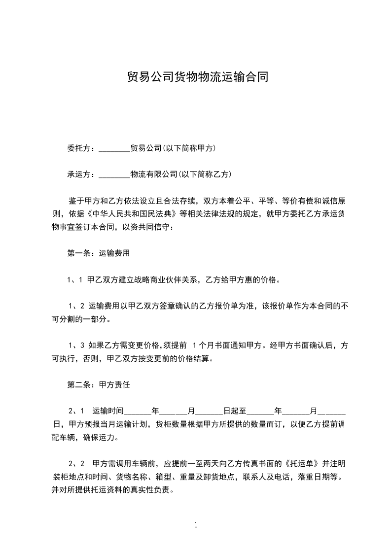 2、1 运输时间_______年_______月_______日起至_______年_______月_______日,甲方预报当月运输计划,货柜数量根据甲方所提供的数量而订,以便乙方提前调配车辆,确保运力。