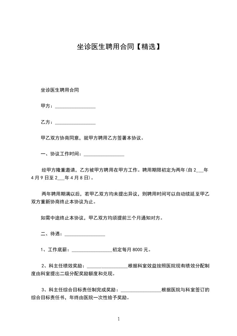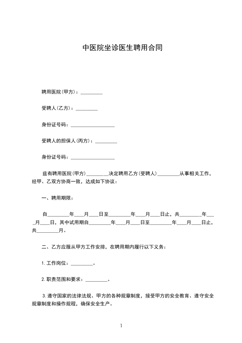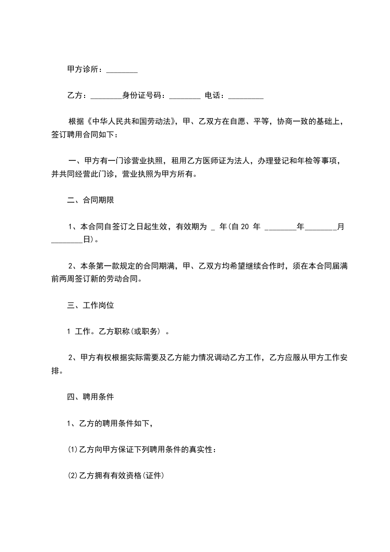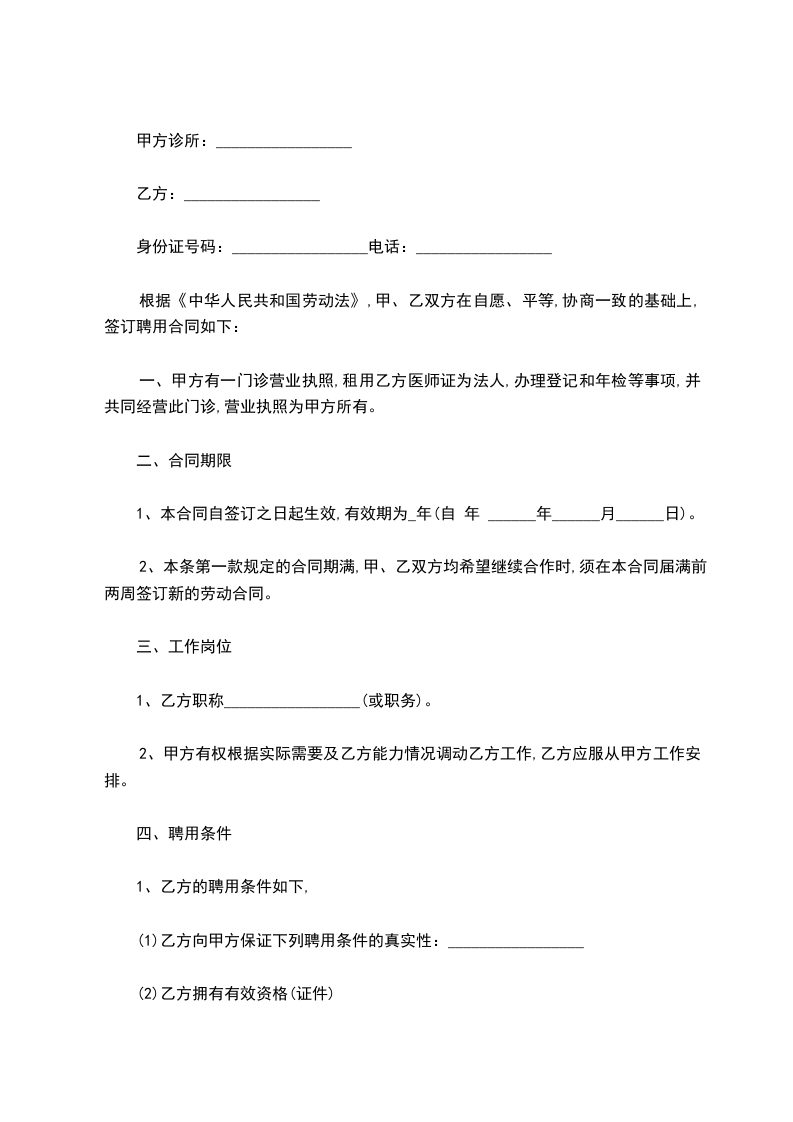 1、甲方聘用乙方为坐诊医生,聘用期限为三个月,自____年________月________日至____年________月________日。聘期内乙方每日下午________时至________时________分在甲方坐班工作。