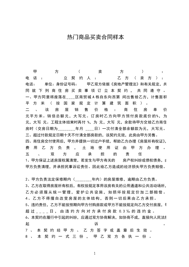 电话: 单位:身份证号码: 甲乙双方依据《房地产管理法》和有关规定,共同就下列商住房买卖事项订立本契约,共同遵守。
