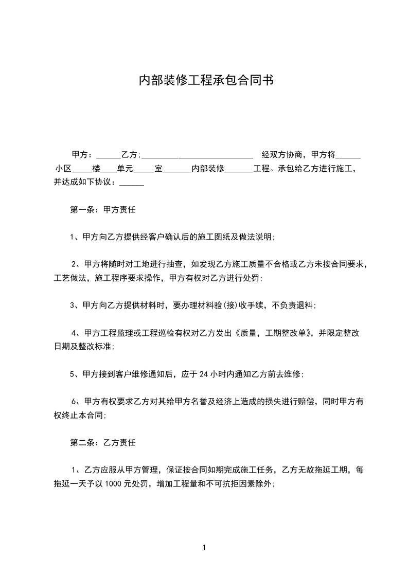 1、乙方应服从甲方管理,保证按合同如期完成施工任务,乙方无故拖延工期,每拖延一天予以1000元处罚,增加工程量和不可抗拒因素除外;