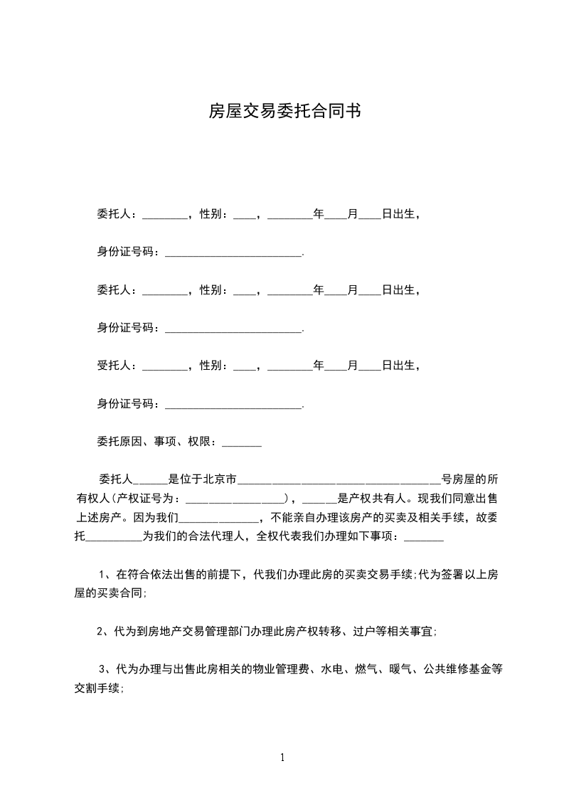 委托人______是位于北京市___________________________________号房屋的所有权人(产权证号为:_________________),______是产权共有人。现我们同意出售上述房产。因为我们______________,不能亲自办理该房产的买卖及相关手续,故委托__________为我们的合法代理人,全权代表我们办理如下事项:_______