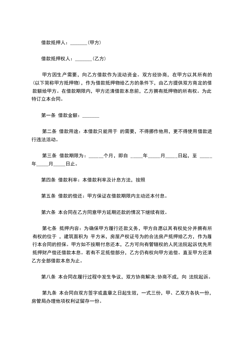 甲方因生产需要,向乙方借款作为流动资金。双方经协商,在甲方以其所有的 (以下简称甲方抵押物),作为借款抵押物给乙方的条件下,由乙方提供双方商定的借款额给甲方。在借款期限内,甲方还清借款本息前,乙方拥有抵押物的所有权。为此,特订立本合同。