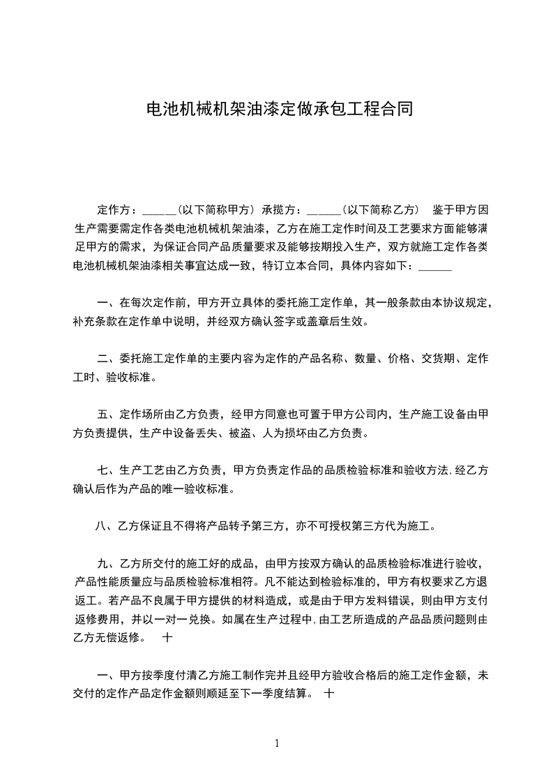 定作方:______(以下简称甲方) 承揽方:______(以下简称乙方) 鉴于甲方因生产需要需定作各类电池机械机架油漆,乙方在施工定作时间及工艺要求方面能够满足甲方的需求,为保证合同产品质量要求及能够按期投入生产,双方就施工定作各类电池机械机架油漆相关事宜达成一致,特订立本合同,具体内容如下:______