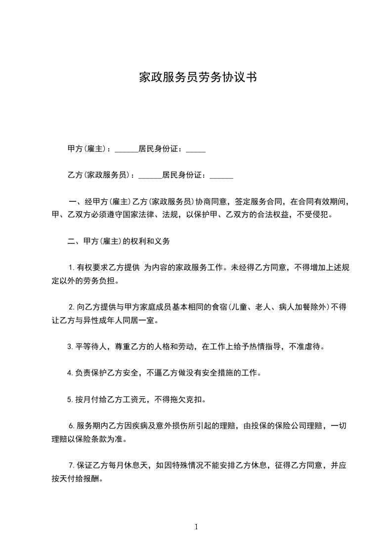 甲方:______身份证号码:______乙方:______乙方为______市劳动局批准的家政服务实体。现应甲方申请,乙方承诺为甲方提供清洁服务。为了明确双方的权利、义务,特订立如下合同,供双方共同遵守。