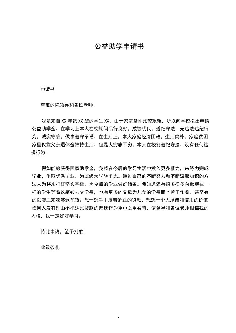 我是来自XX年纪XX班的学生XX,由于家庭条件比较艰难,所以向学校提出申请公益助学金。在学习上本人在校期间品行良好,成绩优良,遵纪守法,无违法违纪行为,诚实守信,做事遵守承诺,在生活上,本人家庭经济困难,生活简朴,家庭贫困,家里仅靠父亲退休金维持生活,但是人穷志不穷,本人在校能遵纪守法,没有任何违规行为。