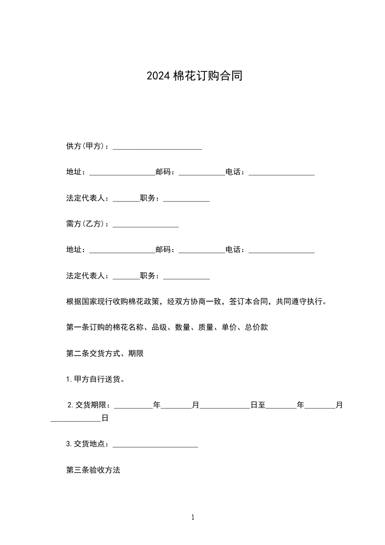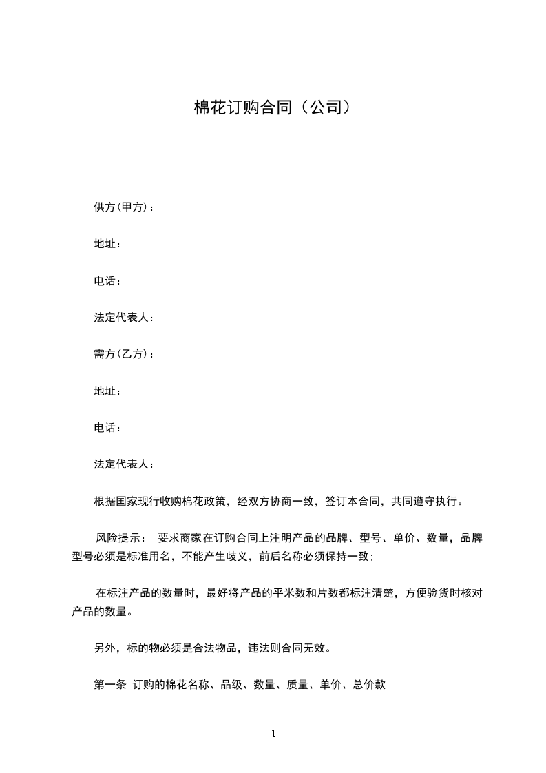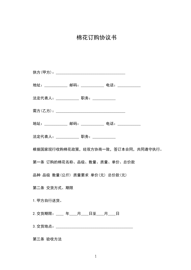 第一条 订购的棉花名称、品级、数量、质量、单价、总价款