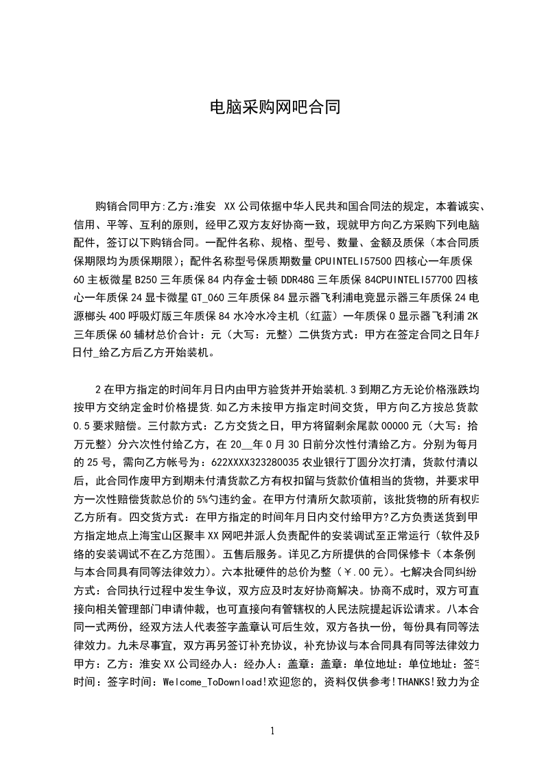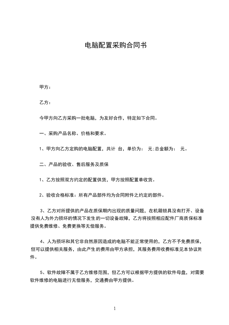 1、甲方向乙方定购的电脑配置,(详见附页一;电脑设备配置单)共计 ___台,单价为:______元; 总金额为:______元。