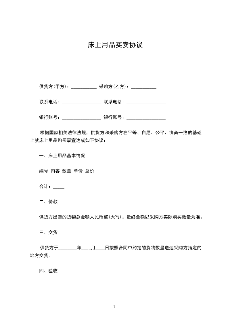 根据国家相关法律法规,供货方和采购方在平等、自愿、公平、协商一致的基础上就床上用品购买事宜达成如下协议: