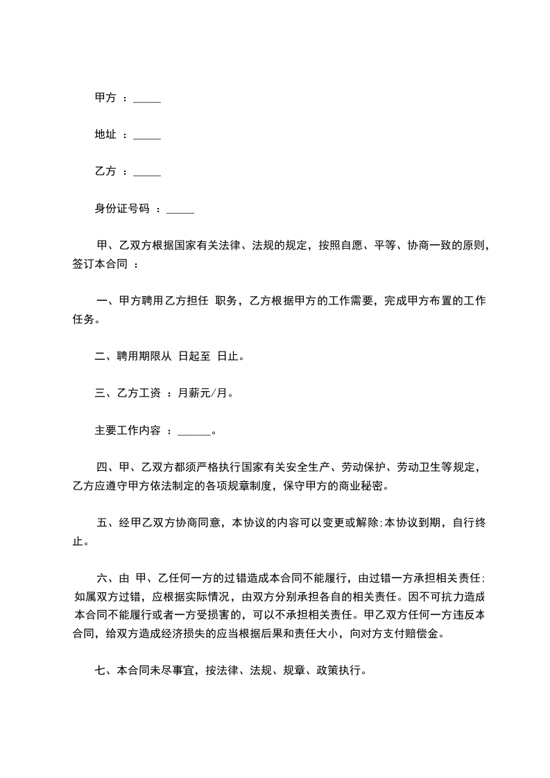 一、聘用期:从_______年_______月_______日至_______年_______月_______日止。合同期满,双方可以办理续签事宜。