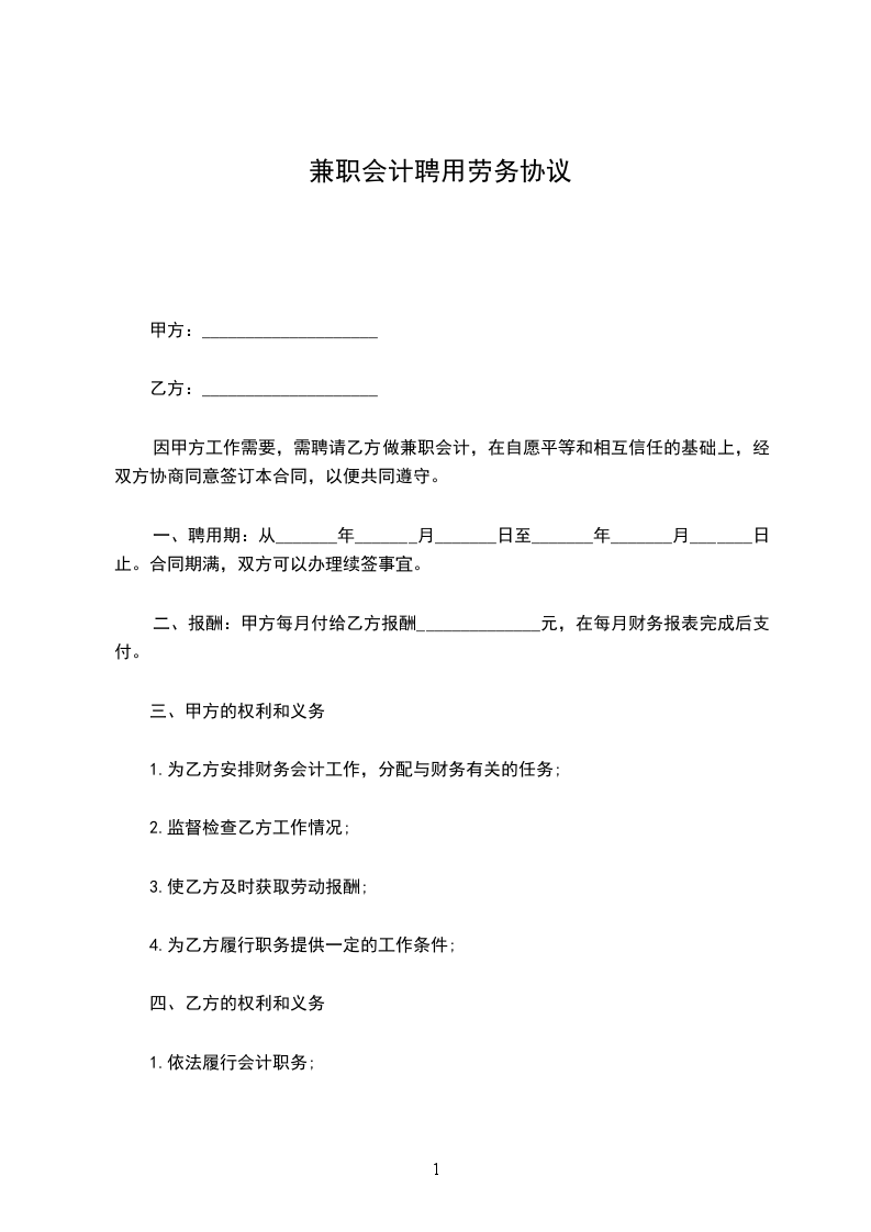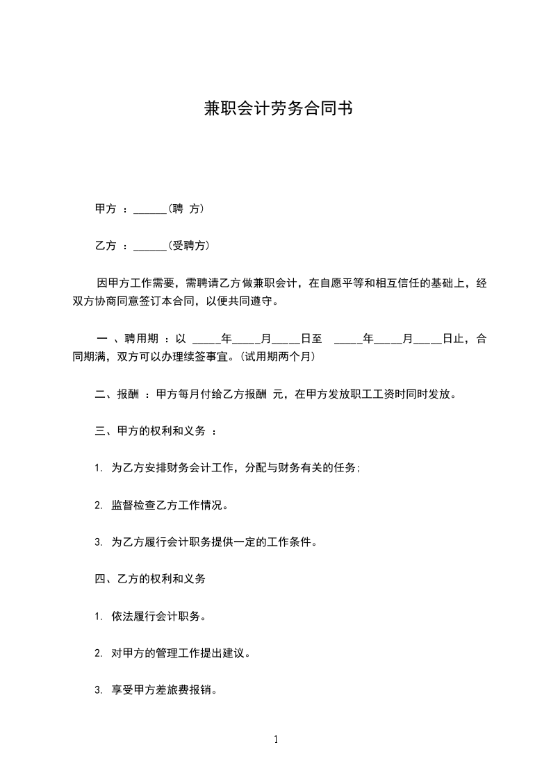 二、报酬:甲方每月付给乙方报酬______________元,在每月财务报表完成后支付。