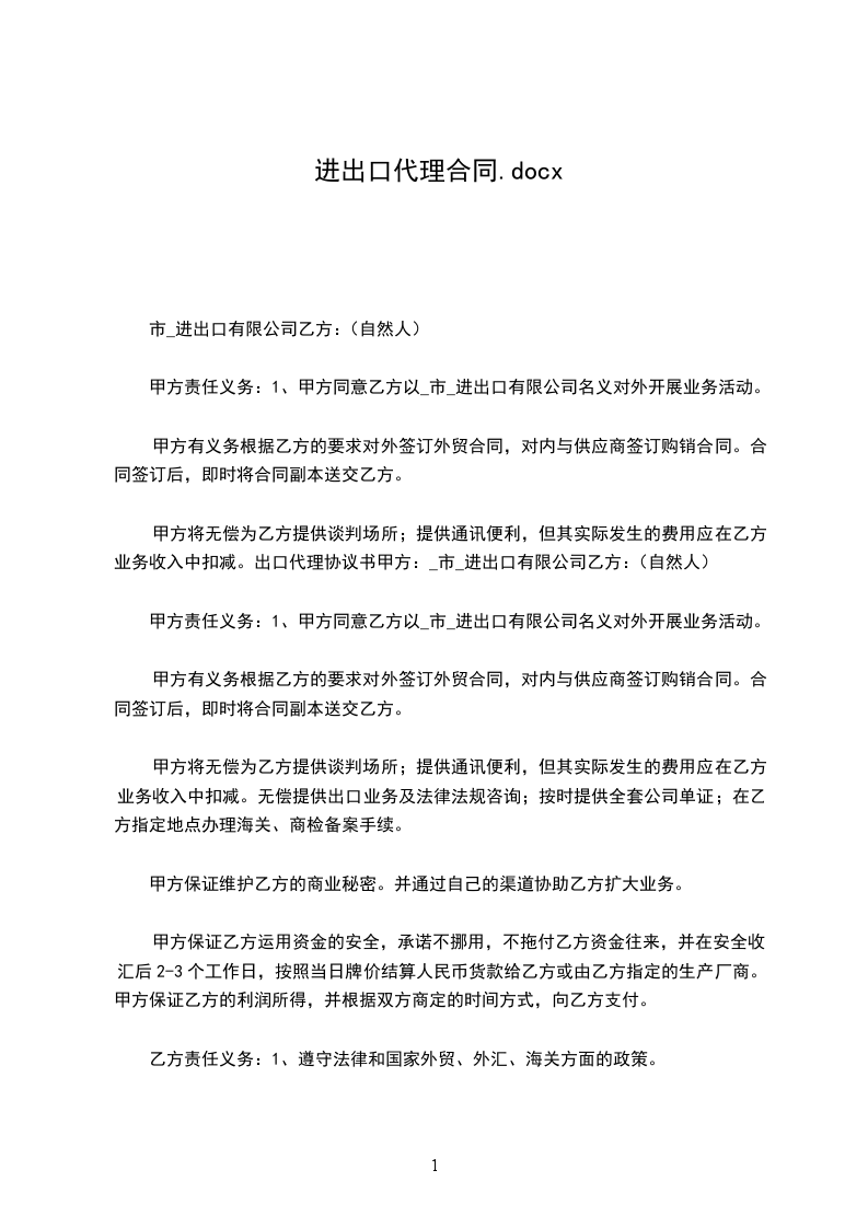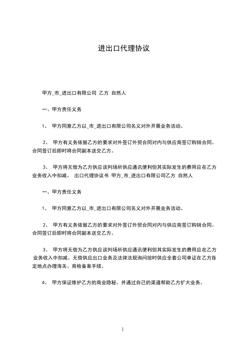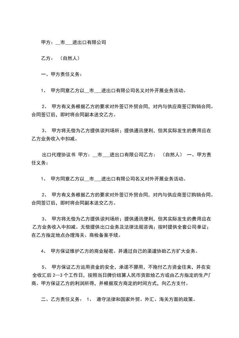 出口代理协议书 甲方:__市___进出口有限公司乙方: (自然人) 一、甲方责任义务: