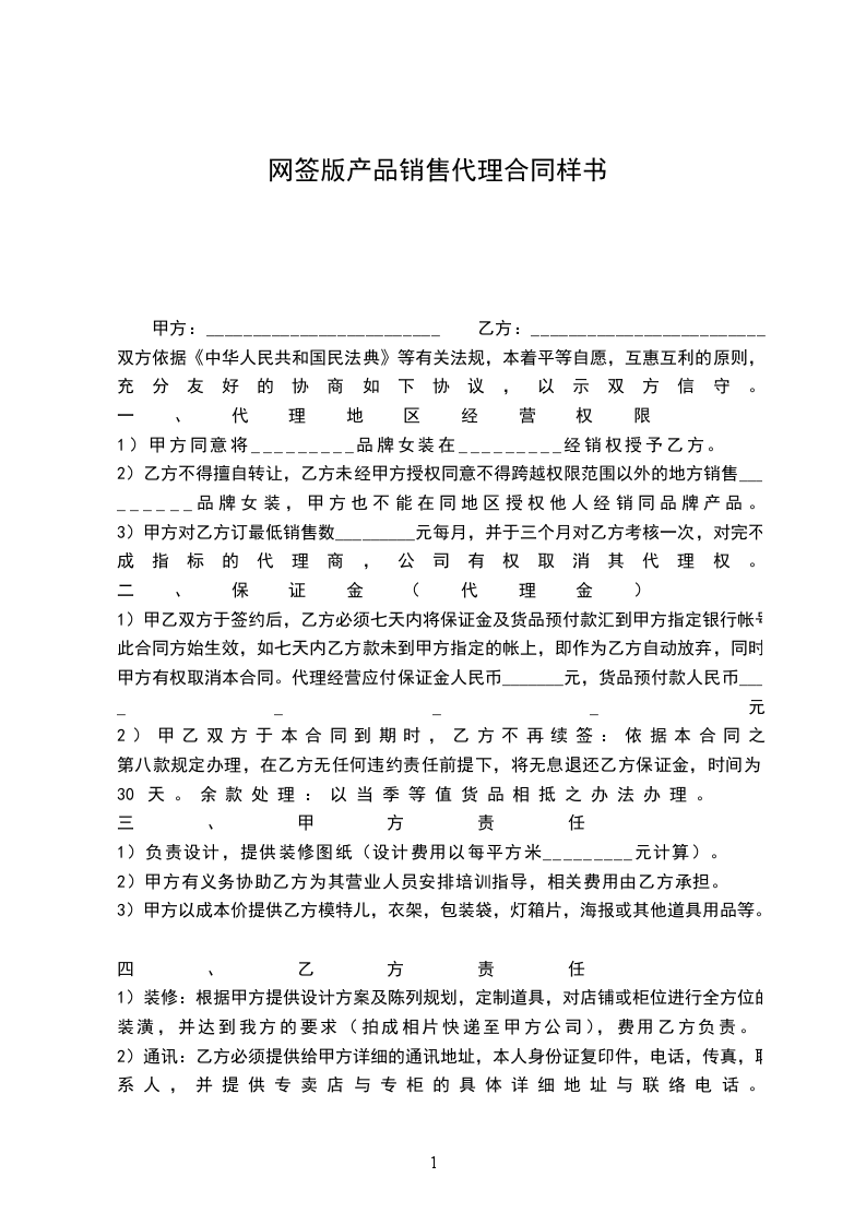 4)每星期一乙方应将上个星期的销售情况报表传真至甲方,以便甲方了解市场信息销售动态。