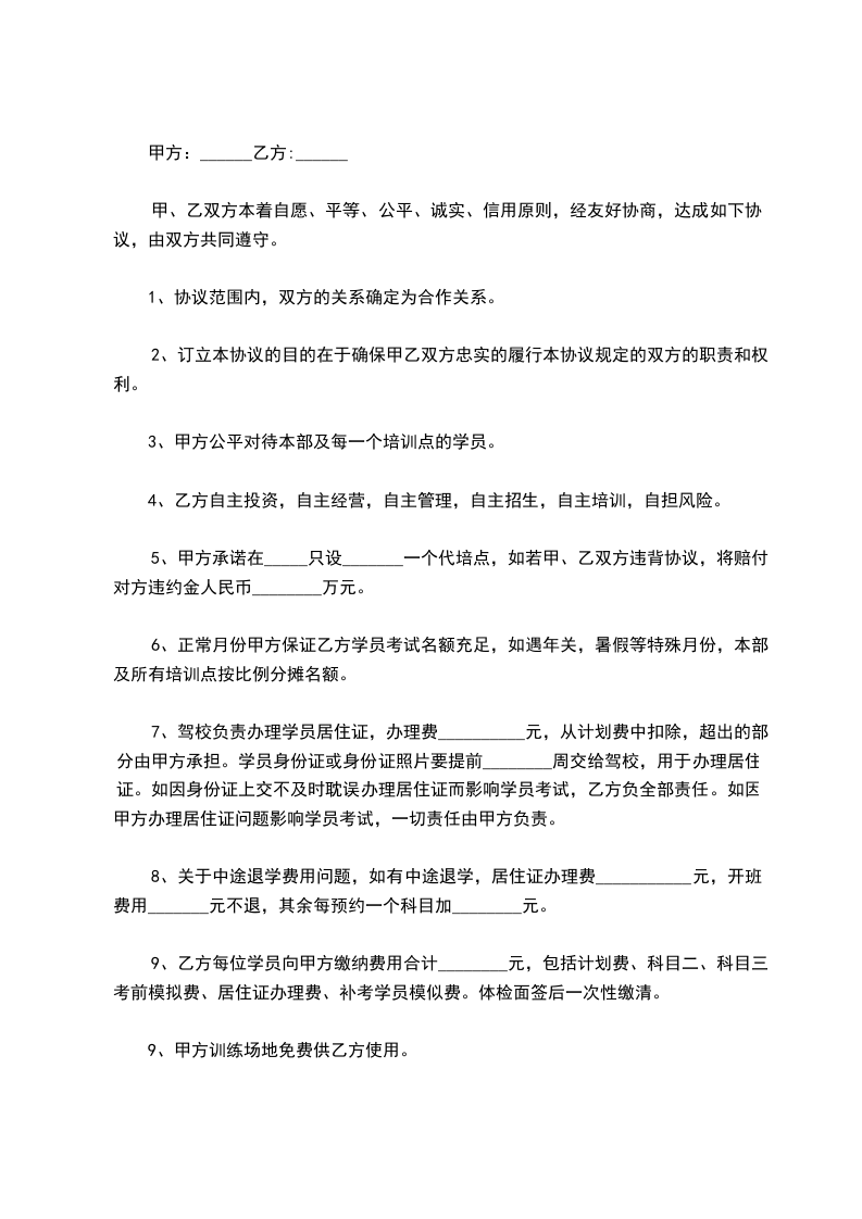 12、乙方教练及学员到甲方本部以外训练、考试产生的住宿费、食用费自理。