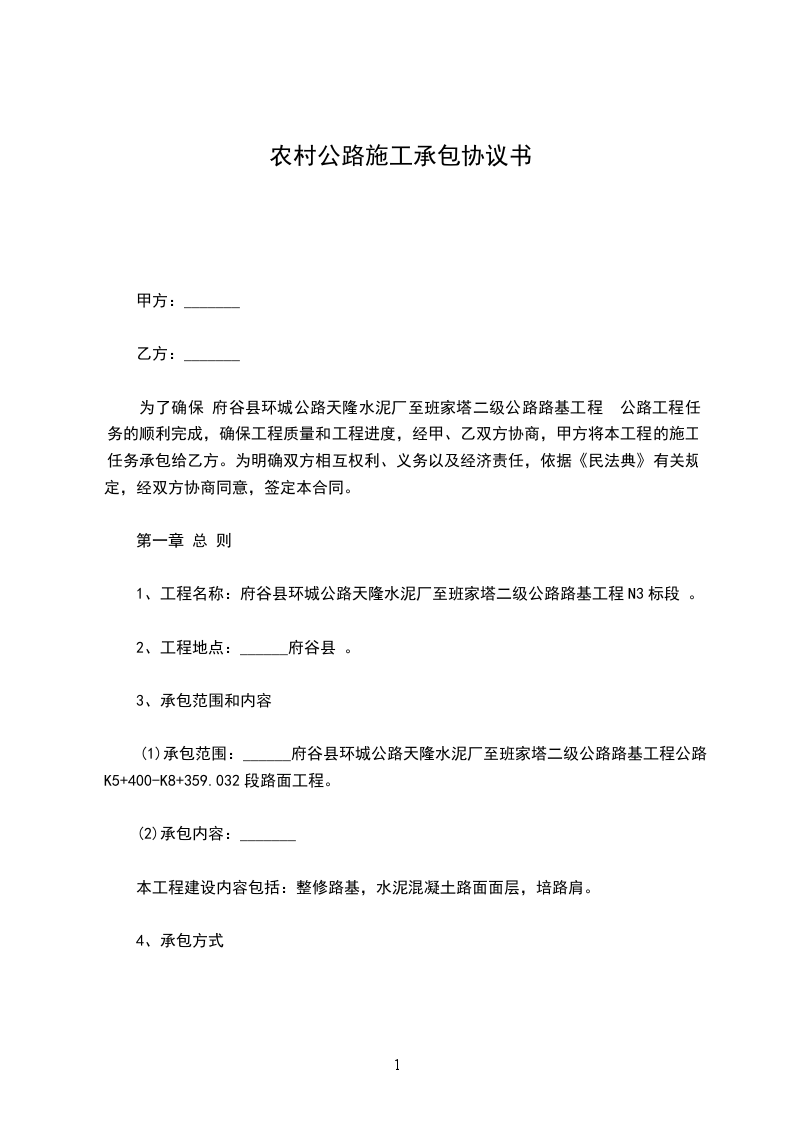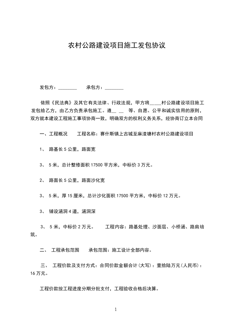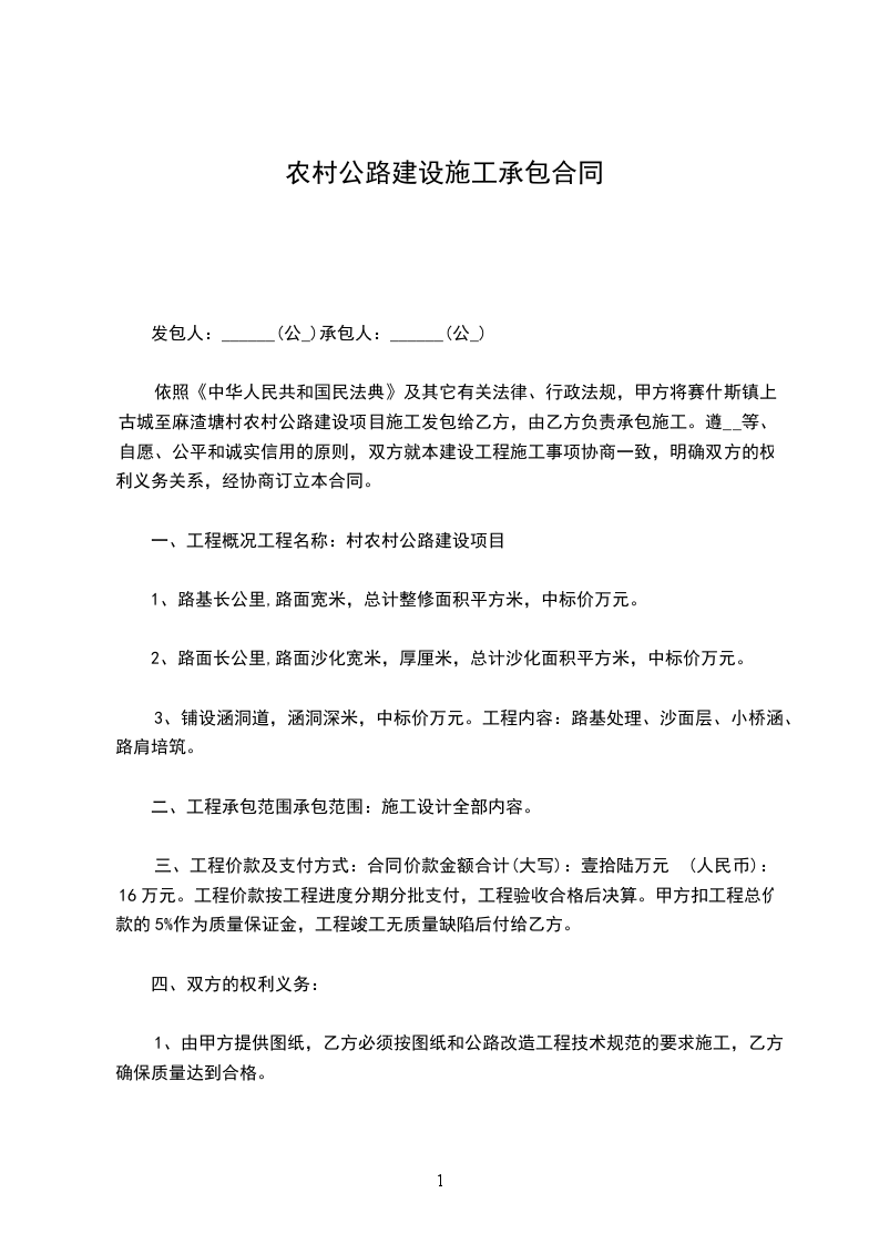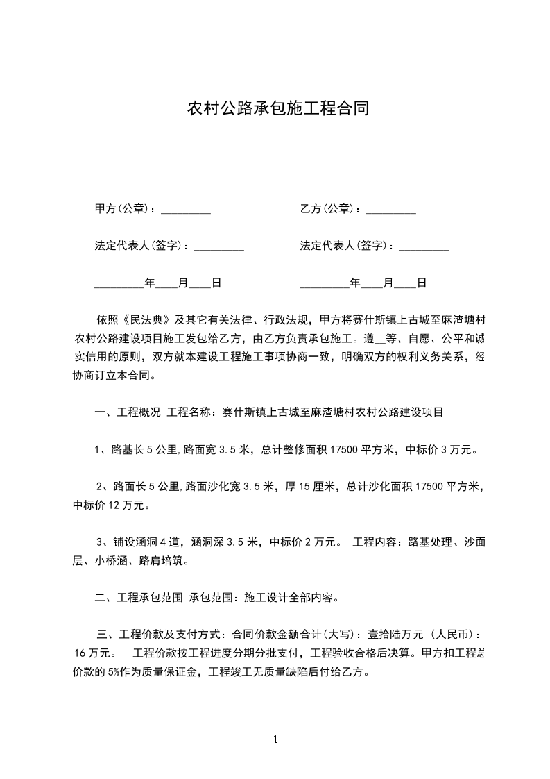 依照《中华人民共和国民法典》及其它有关法律、行政法规,甲方将赛什斯镇上古城至麻渣塘村农村公路建设项目施工发包给乙方,由乙方负责承包施工。遵__等、自愿、公平和诚实信用的原则,双方就本建设工程施工事项协商一致,明确双方的权利义务关系,经协商订立本合同。