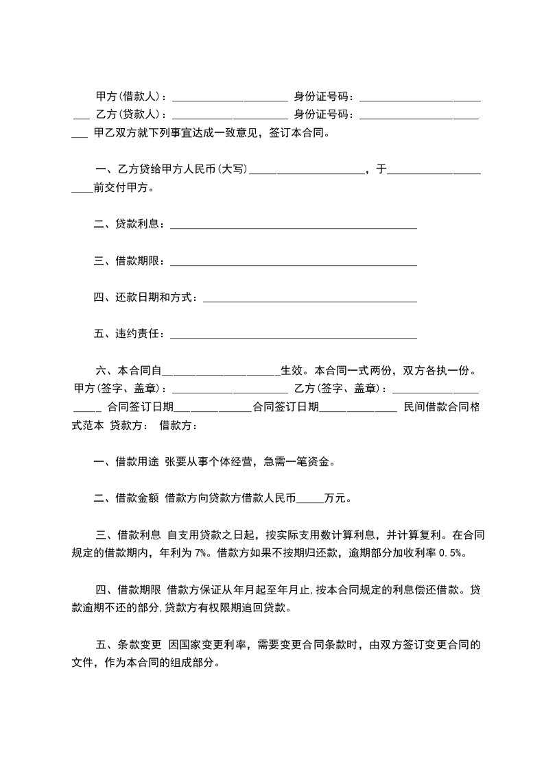 六、本合同自_____________________生效。本合同一式两份,双方各执一份。 甲方(签字、盖章):_____________________ 乙方(签字、盖章):_____________________ 合同签订日期______________合同签订日期______________ 民间借款合同格式范本 贷款方: 借款方: