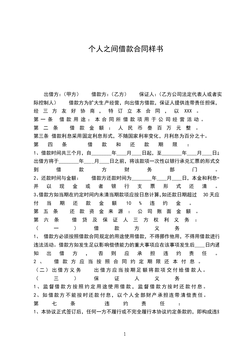 出借方:(甲方) 借款方:(乙方) 保证人:(乙方公司法定代表人或者实际控制人) 借款方为扩大生产经营,向出借方借款,保证人提供连带责任担保,经三方友好协商,特订立本合同,以XXX。