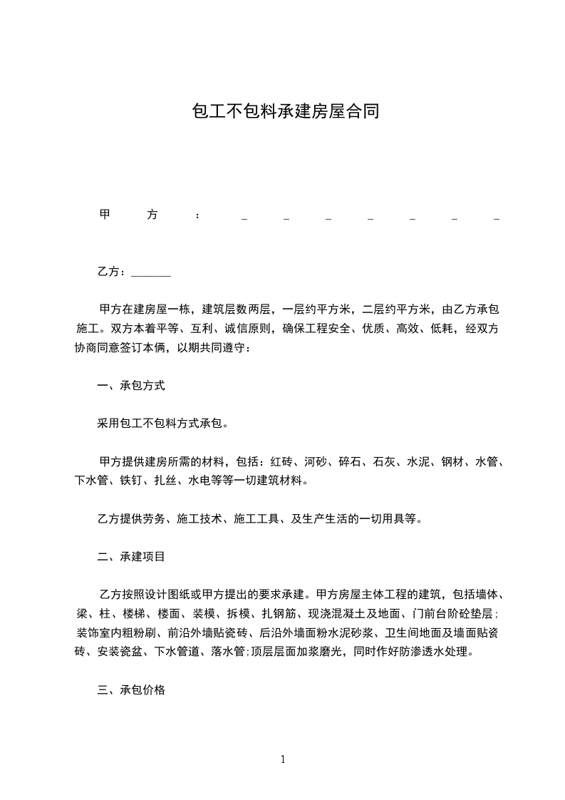 甲方在建房屋一栋,建筑层数两层,一层约平方米,二层约平方米,由乙方承包施工。双方本着平等、互利、诚信原则,确保工程安全、优质、高效、低耗,经双方协商同意签订本俩,以期共同遵守: