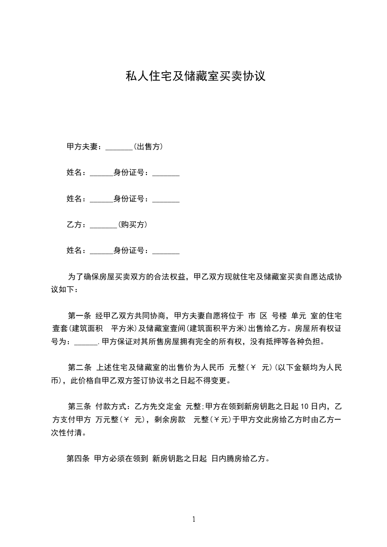 第一条 经甲乙双方共同协商,甲方夫妻自愿将位于 市 区 号楼 单元 室的住宅壹套(建筑面积 平方米)及储藏室壹间(建筑面积平方米)出售给乙方。房屋所有权证号为:______.甲方保证对其所售房屋拥有完全的所有权,没有抵押等各种负担。