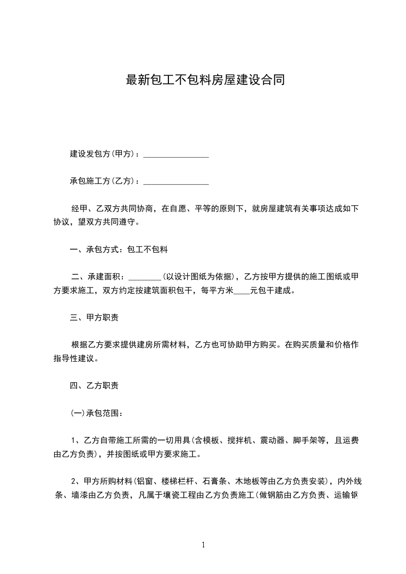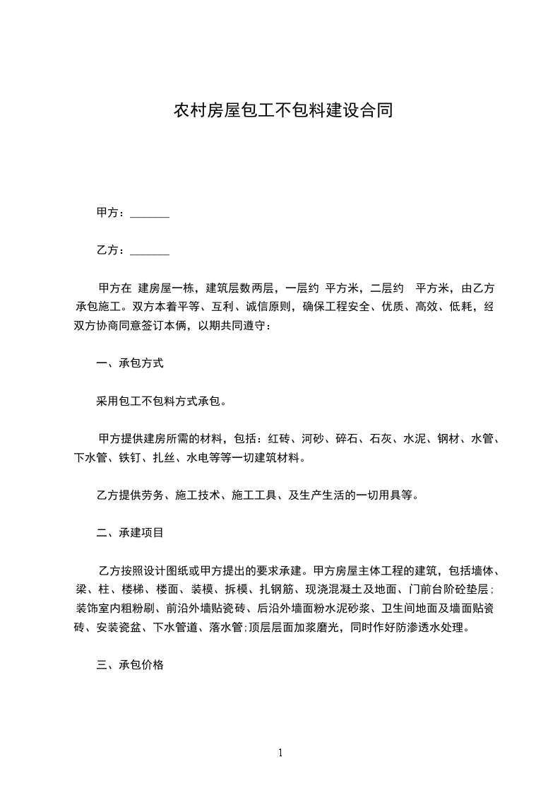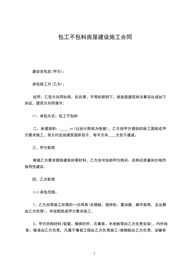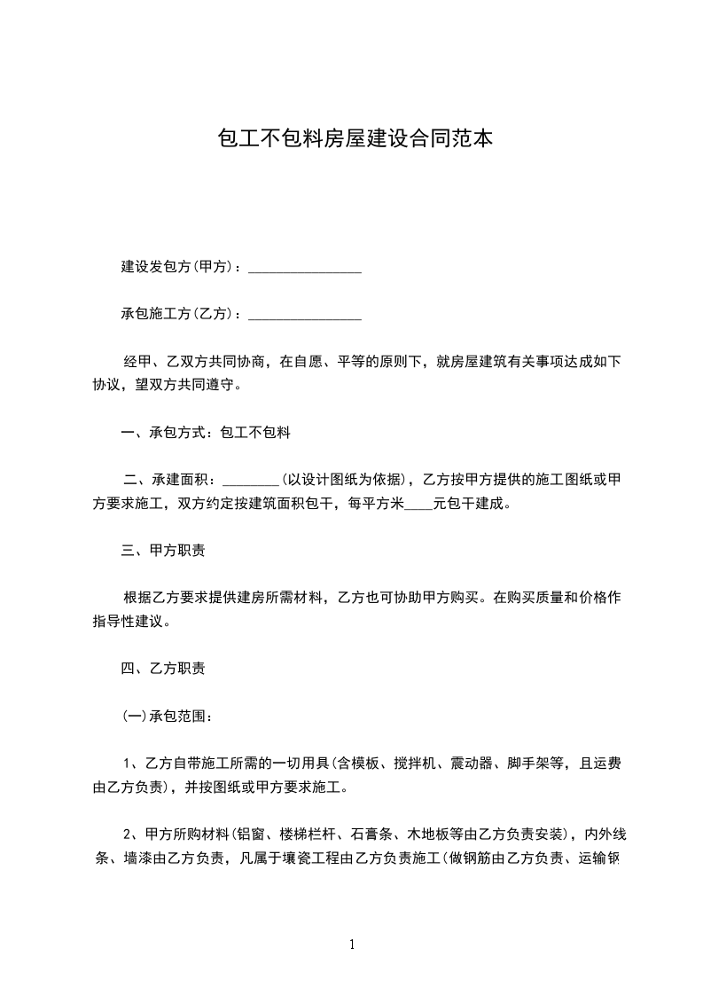 甲方在建房屋___栋,建筑层数___层,___层约_____平方米,___层约_____平方米,由乙方承包施工。双方本着平等、互利、诚信原则,确保工程安全、优质、高效、低耗,经双方协商同意签订本俩,以期共同遵守:一、承包方式