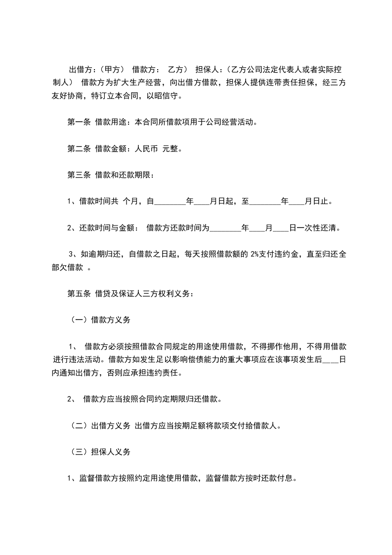 出借方:(甲方) 借款方: 乙方) 担保人:(乙方公司法定代表人或者实际控制人) 借款方为扩大生产经营,向出借方借款,担保人提供连带责任担保,经三方友好协商,特订立本合同,以昭信守。