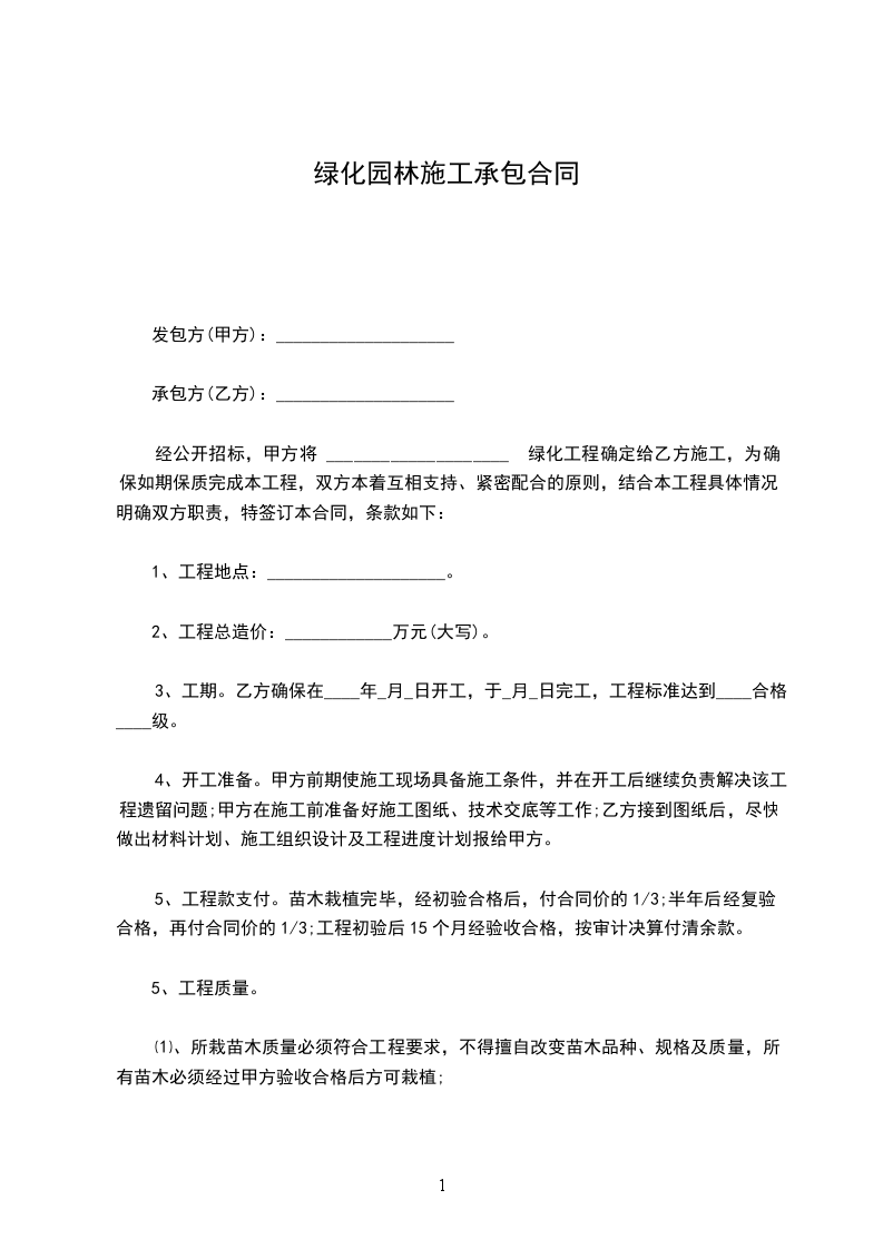 经公开招标,甲方将 ____________________ 绿化工程确定给乙方施工,为确保如期保质完成本工程,双方本着互相支持、紧密配合的原则,结合本工程具体情况,明确双方职责,特签订本合同,条款如下: