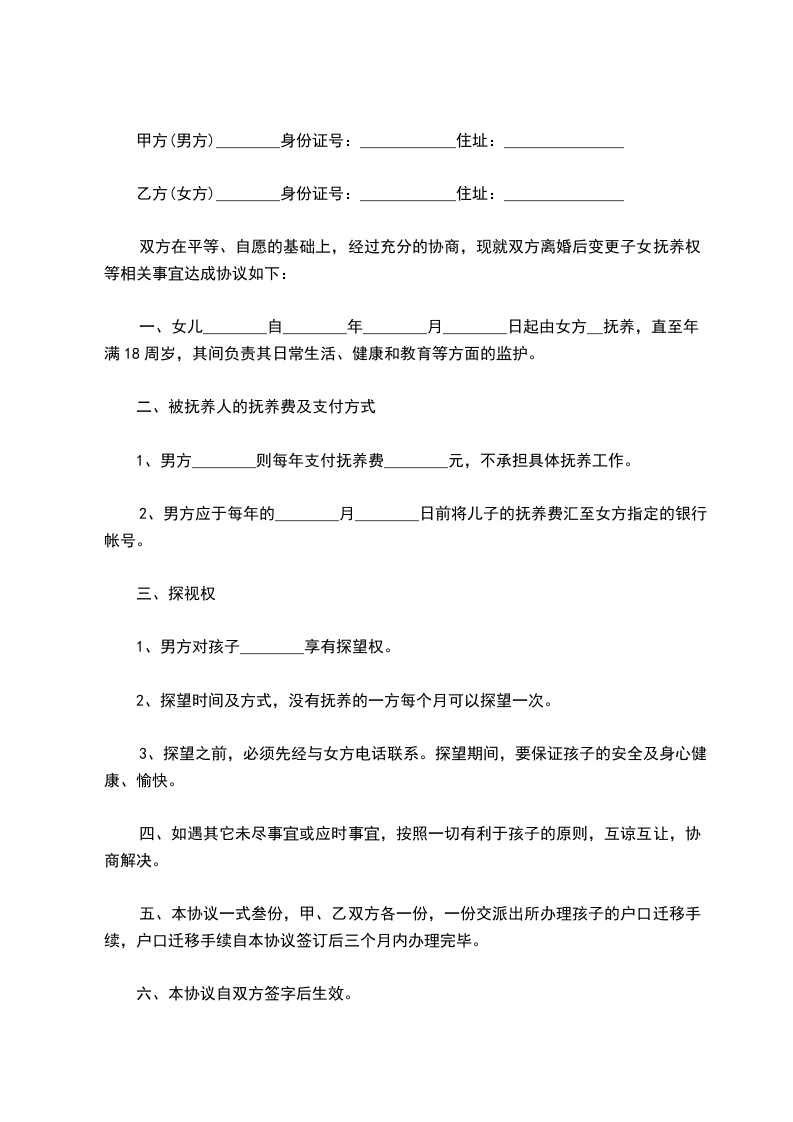 协议人(女方):______________ 身份证号:_________________________