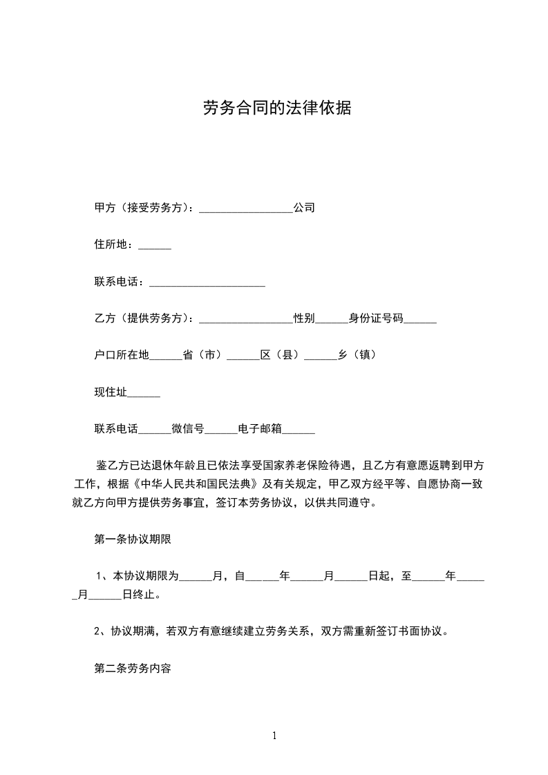 鉴乙方已达退休年龄且已依法享受国家养老保险待遇,且乙方有意愿返聘到甲方工作,根据《中华人民共和国民法典》及有关规定,甲乙双方经平等、自愿协商一致,就乙方向甲方提供劳务事宜,签订本劳务协议,以供共同遵守。