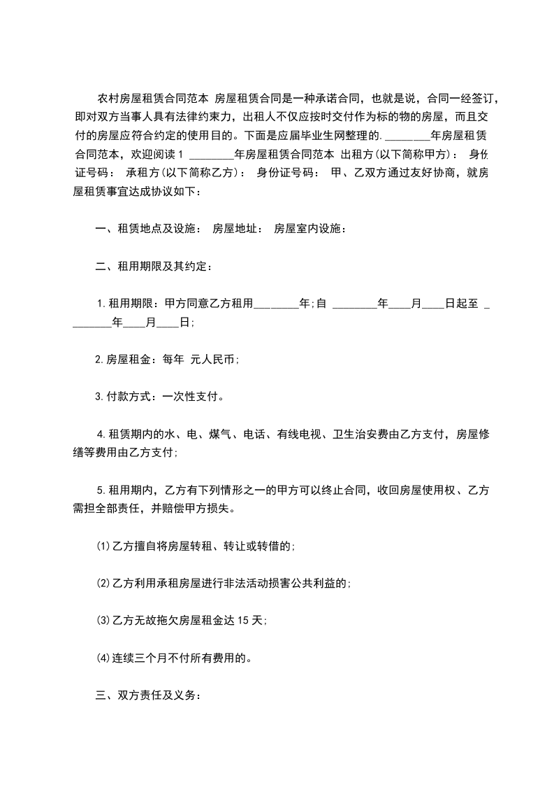 农村房屋租赁合同范本 房屋租赁合同是一种承诺合同,也就是说,合同一经签订,即对双方当事人具有法律约束力,出租人不仅应按时交付作为标的物的房屋,而且交付的房屋应符合约定的使用目的。下面是应届毕业生网整理的.________年房屋租赁合同范本,欢迎阅读1 ________年房屋租赁合同范本 出租方(以下简称甲方): 身份证号码: 承租方(以下简称乙方): 身份证号码: 甲、乙双方通过友好协商,就房屋租赁事宜达成协议如下: