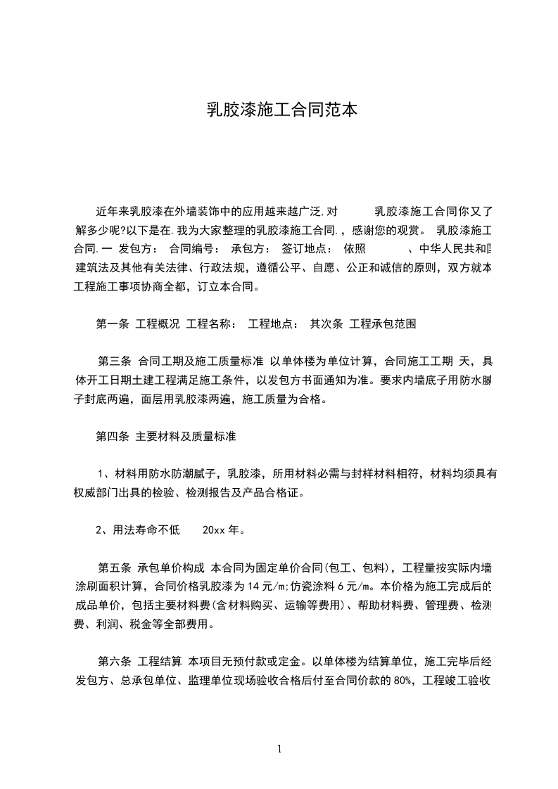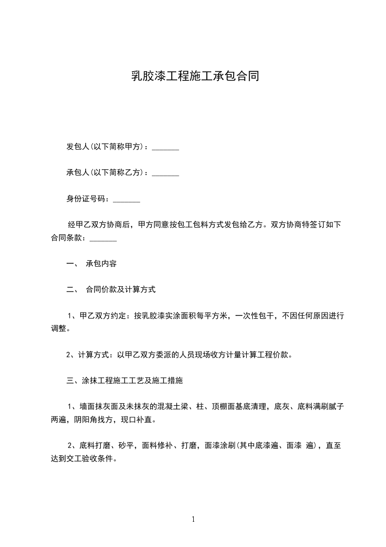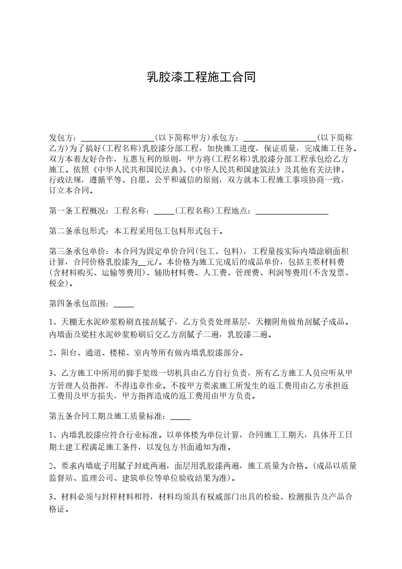 发包方:__________________(以下简称甲方)承包方:__________________(以下简称乙方)为了搞好(工程名称)乳胶漆分部工程,加快施工进度,保证质量,完成施工任务。双方本着友好合作,互惠互利的原则,甲方将(工程名称)乳胶漆分部工程承包给乙方施工。依照《中华人民共和国民法典》、《中华人民共和国建筑法》及其他有关法律、行政法规,遵循平等、自愿、公平和诚信的原则,双方就本工程施工事项协商一致,订立本合同。