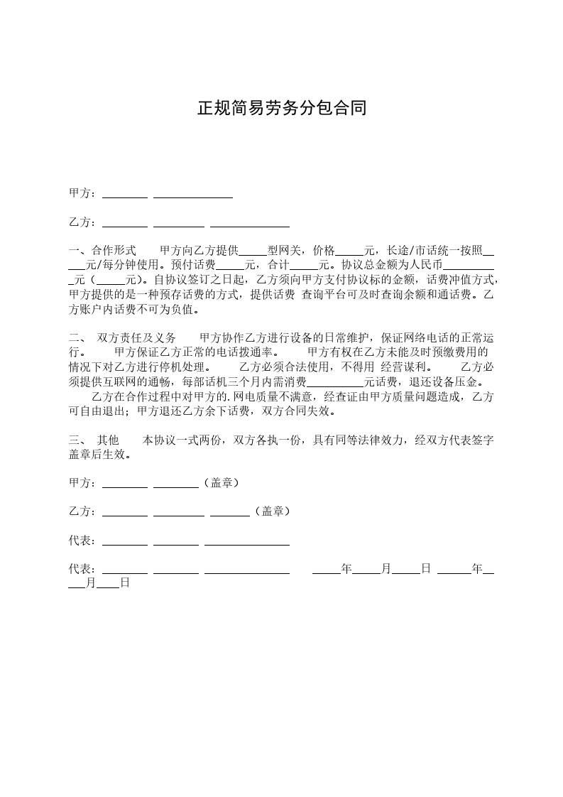 二、 双方责任及义务 甲方协作乙方进行设备的日常维护,保证网络电话的正常运行。 甲方保证乙方正常的电话拨通率。 甲方有权在乙方未能及时预缴费用的情况下对乙方进行停机处理。 乙方必须合法使用,不得用 经营谋利。 乙方必须提供互联网的通畅,每部话机三个月内需消费__________元话费,退还设备压金。 乙方在合作过程中对甲方的.网电质量不满意,经查证由甲方质量问题造成,乙方可自由退出;甲方退还乙方余下话费,双方合同失效。