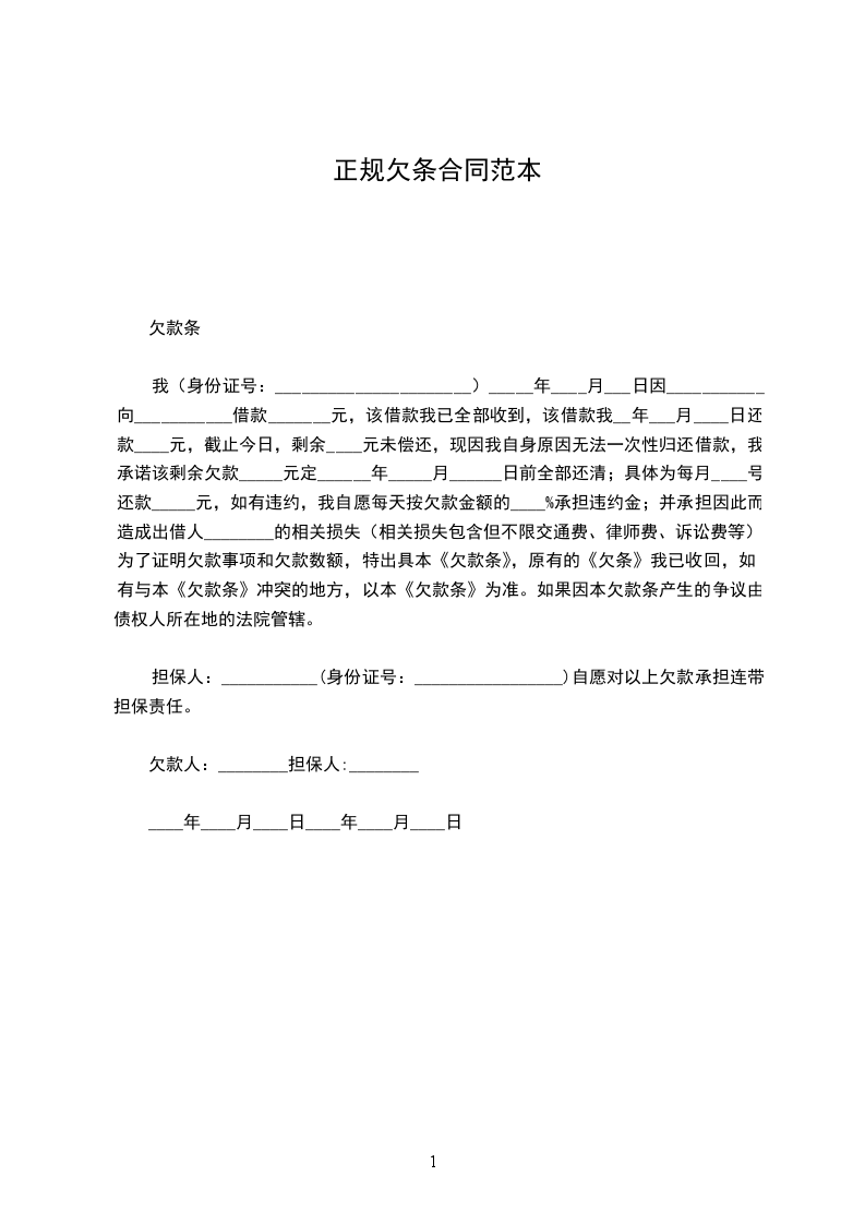 我(身份证号:______________________)_____年____月___日因___________向___________借款_______元,该借款我已全部收到,该借款我__年___月____日还款____元,截止今日,剩余____元未偿还,现因我自身原因无法一次性归还借款,我承诺该剩余欠款_____元定______年_____月______日前全部还清;具体为每月____号还款_____元,如有违约,我自愿每天按欠款金额的____%承担违约金;并承担因此而造成出借人________的相关损失(相关损失包含但不限交通费、律师费、诉讼费等),为了证明欠款事项和欠款数额,特出具本《欠款条》,原有的《欠条》我已收回,如有与本《欠款条》冲突的地方,以本《欠款条》为准。如果因本欠款条产生的争议由债权人所在地的法院管辖。