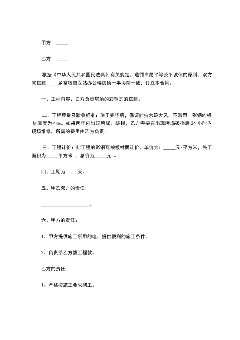 一、工程内容:乙方负责房顶的彩钢瓦的搭建。