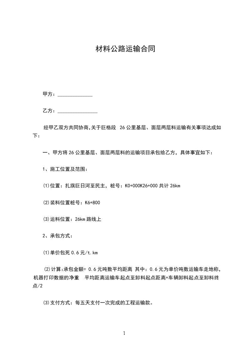 五、乙方将货物交给甲方指定的收货人及开具全额运输费用之日起______日内甲方支付全部运输费用。