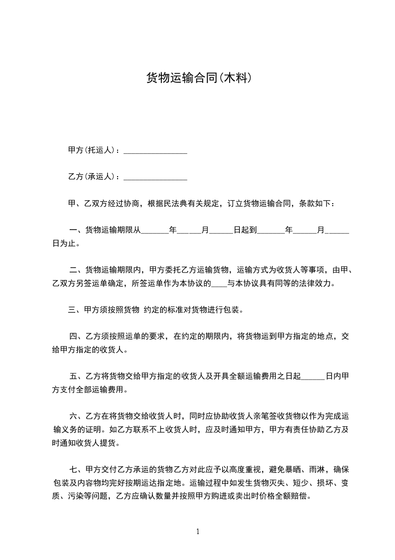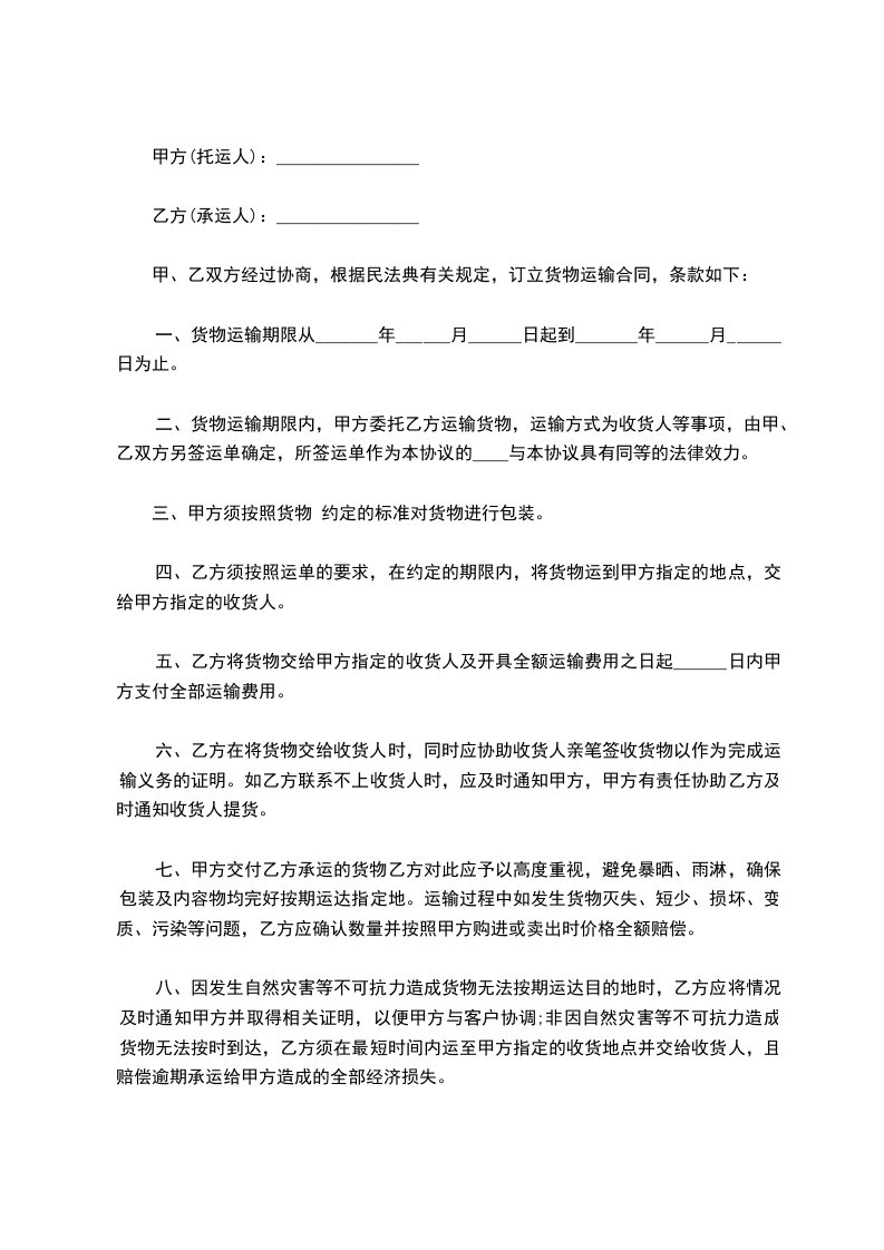 甲、乙双方经过协商,根据民法典有关规定,订立货物运输合同,条款如下: